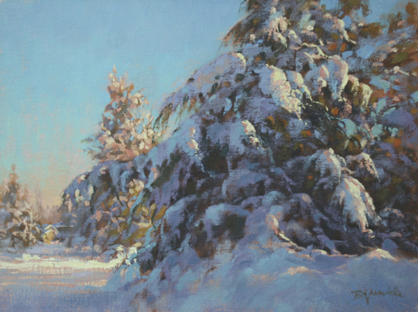 Upper Right: “Hiding Behind the Snowy Juniper,” 12×16 oil/board by Barbara Courtney Jaenicke, OPA, PSA